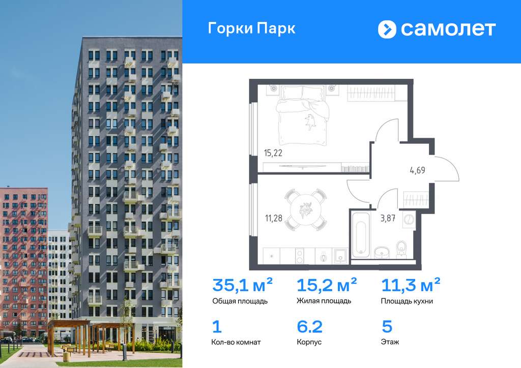 Строим кварталы для жизни с заботой о будущем. Предлагается 1-комнатная квартира комфорт-класса 35,06 кв. м в корпусе 6.2 на 5 этаже, в ЖК «Горки Парк»