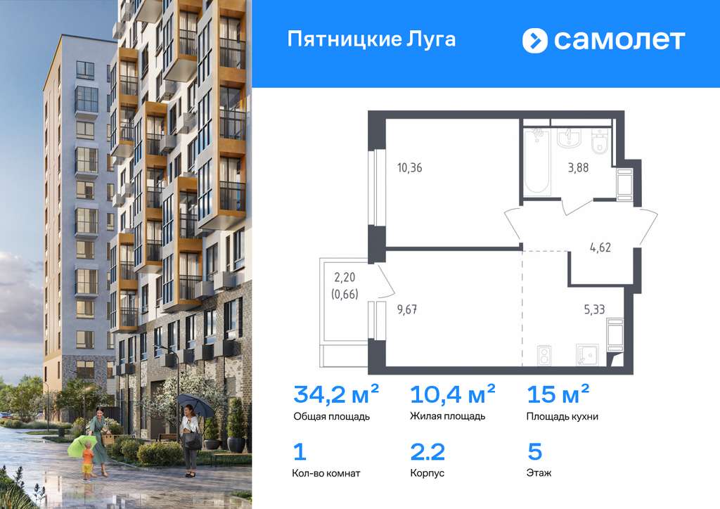 Строим кварталы для жизни с заботой о будущем. Предлагается 1-комнатная квартира комфорт-класса 34,2 кв. м в корпусе 2.2 на 5 этаже, в ЖК «Пятницкие Луга»