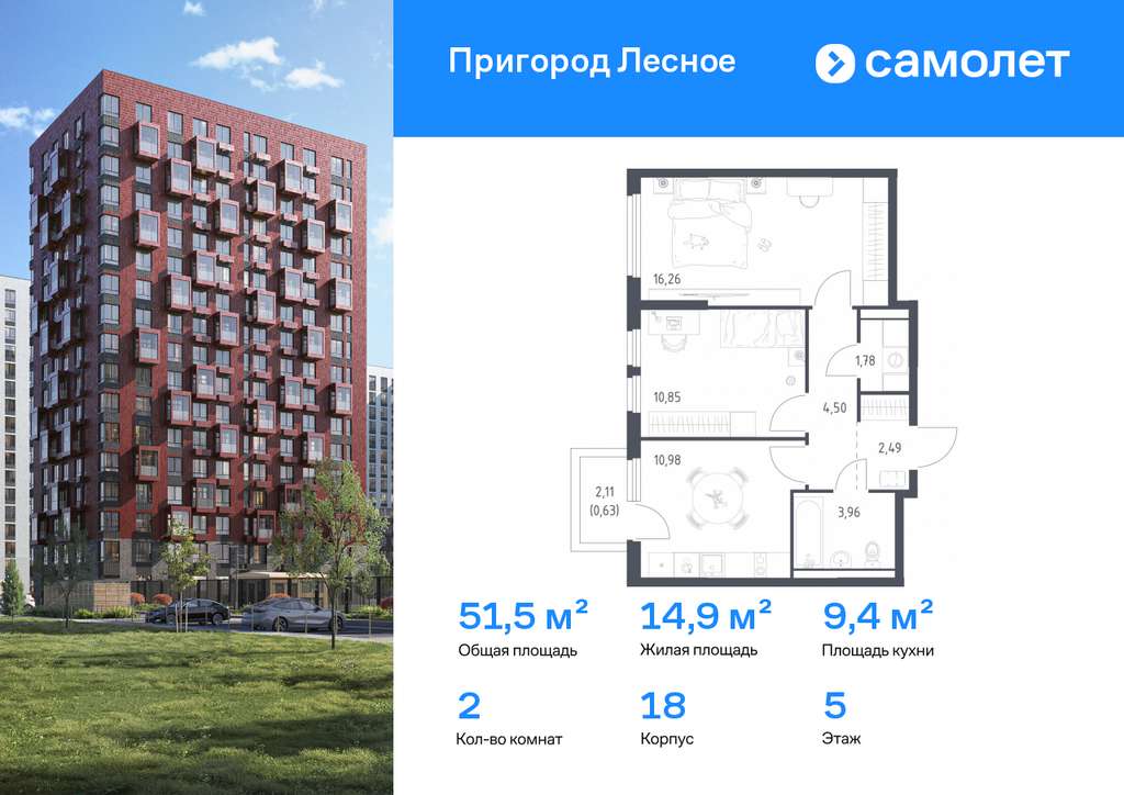 Строим кварталы для жизни с заботой о будущем. Предлагается 2-комнатная квартира комфорт-класса 51,45 кв. м в корпусе 18 на 5 этаже, в ЖК «Пригород Лесное»