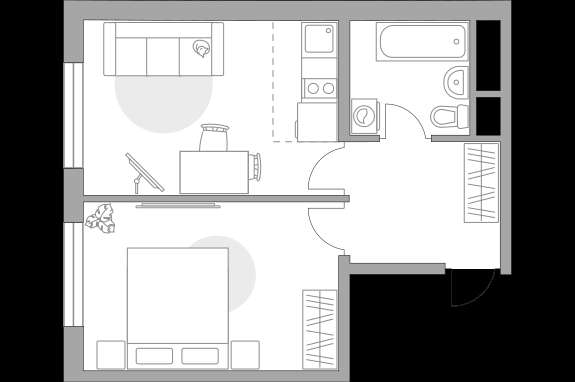 Жилая площадь 22.18 м2, кухня 2.24 м2. Площадь комнат: 11.96/10.22 м2, черновая отделка, окна выходят во двор.