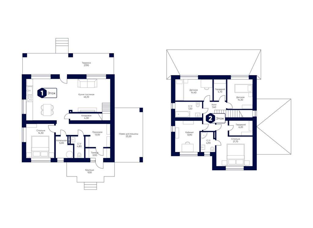 Коттедж «Комфорт» - идеальный дом для большой семьи. Здесь предусмотрены объединённая зона гостиной и кухни с выходом на широкую террасу, а также комната, которую можно обустроить под уютный кабинет. Это идеальное место для работы или учёбы в спокойной обстановке.