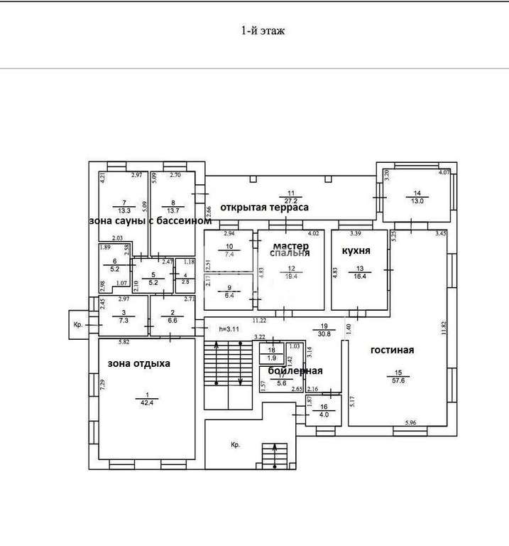 1 этаж - входная группа, бойлерная, гостиная, зона кухни, мастер-спальня, зона сауны с бассейном, зона отдыха, открытая терраса с видом на лес.