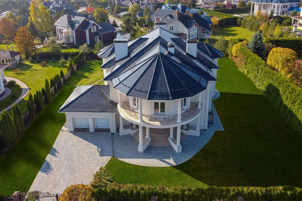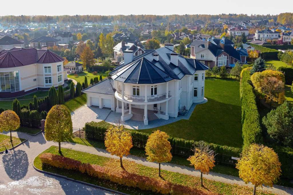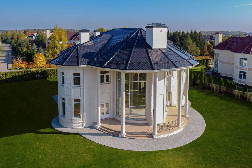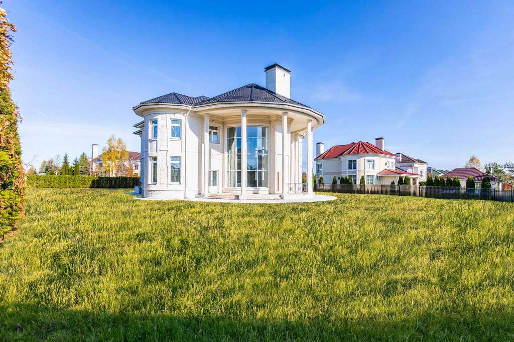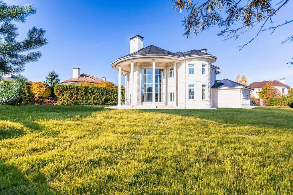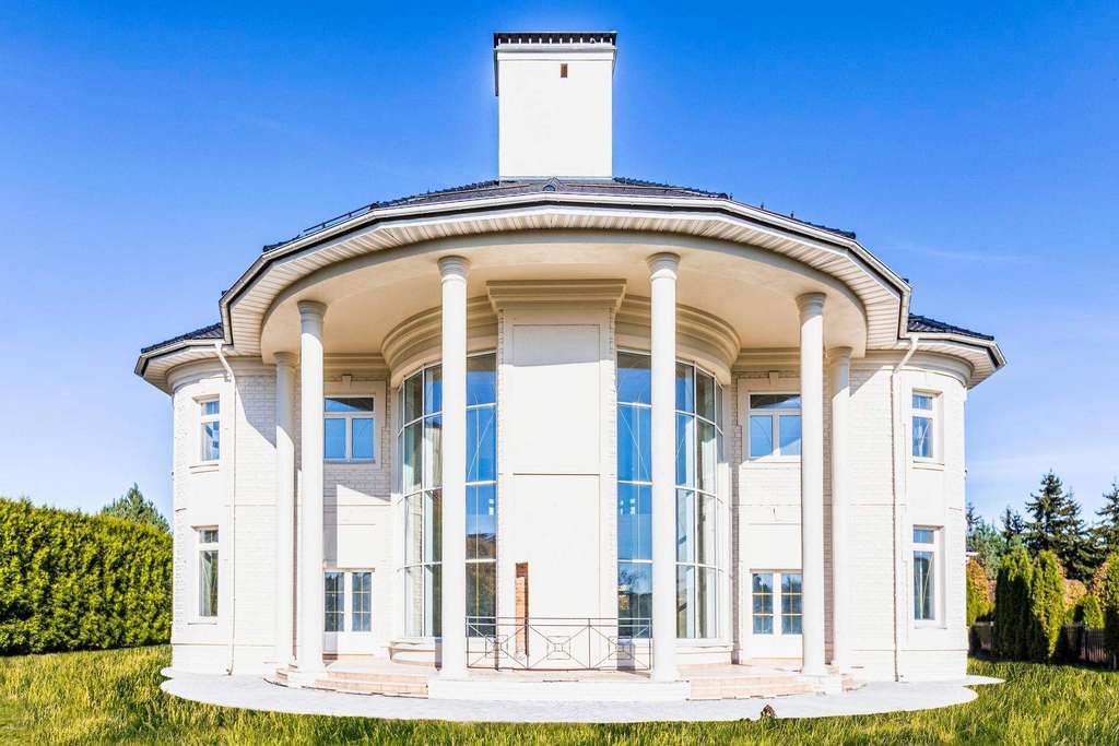 Внутри вам оставлена самая приятная часть: создать интерьеры по вашему вкусу, так как дом предлагается без отделки. На первом этаже расположен роскошный каминный зал со вторым светом и полукруглыми окнами. С двух сторон каминного зала расположены полукруглые гостиная и столовая - каждаяимеет свой выход на полукруглую террасу. Рядом со столовой спланирована кухня.