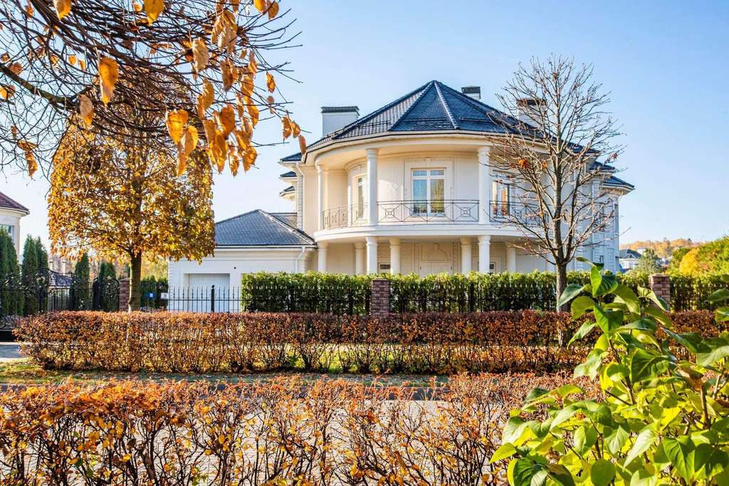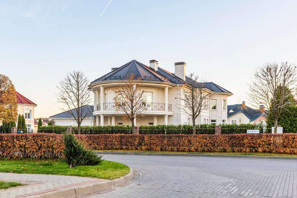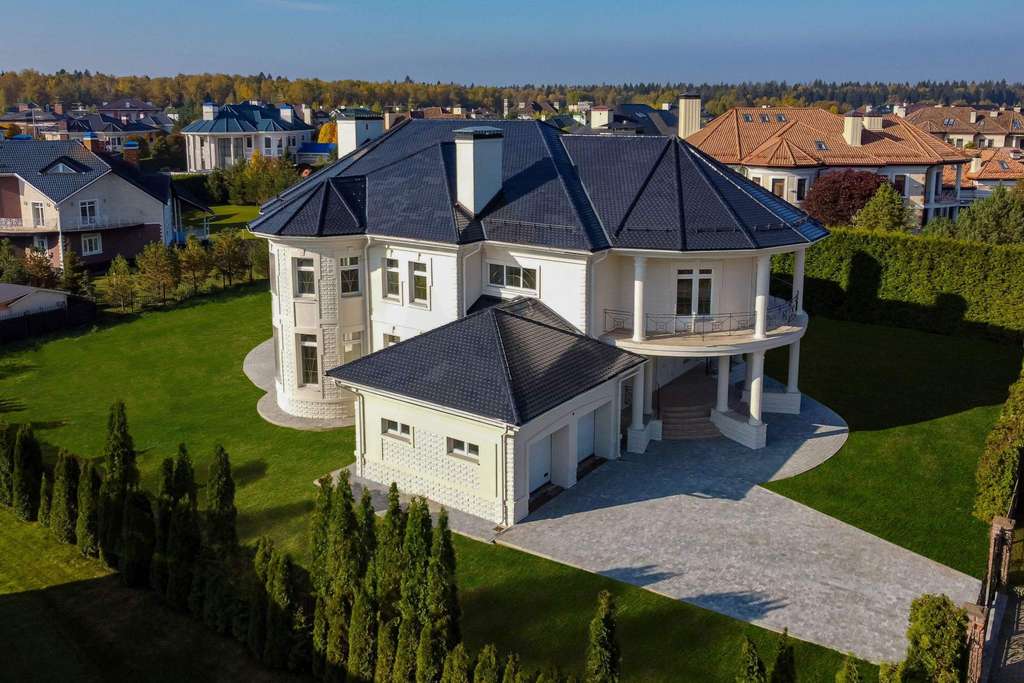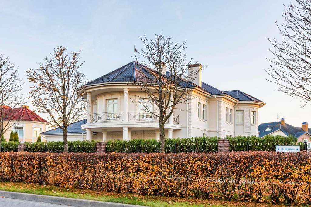На участке площадью 20 соток много свободного пространства, благодаря грамотному расположению дома. От взглядов посторонних особняк укрыт высокой стеной из туй, высаженных по периметру участка.