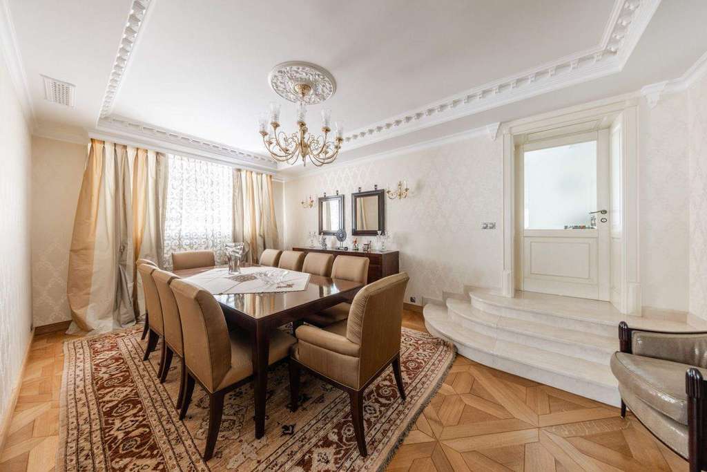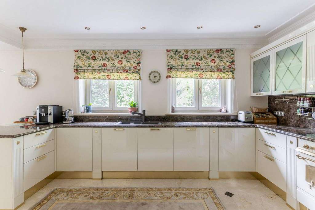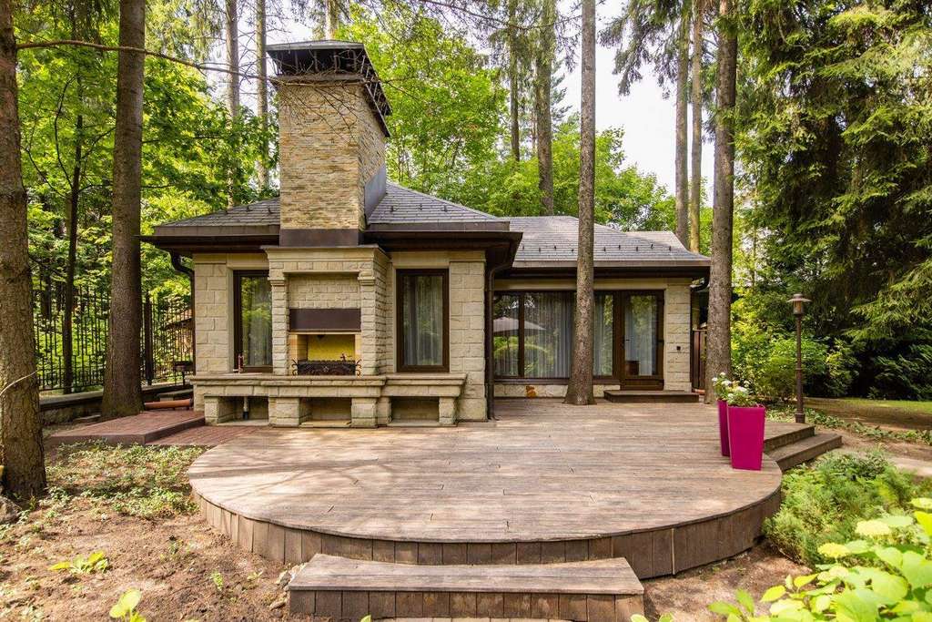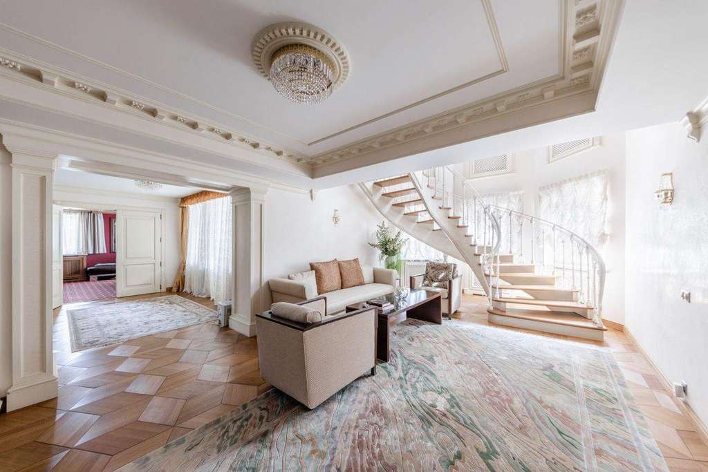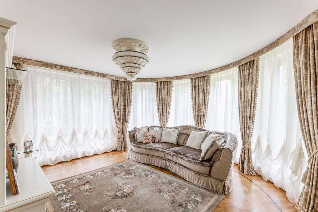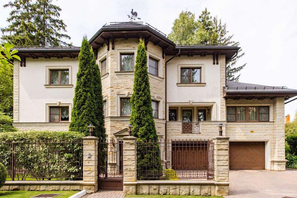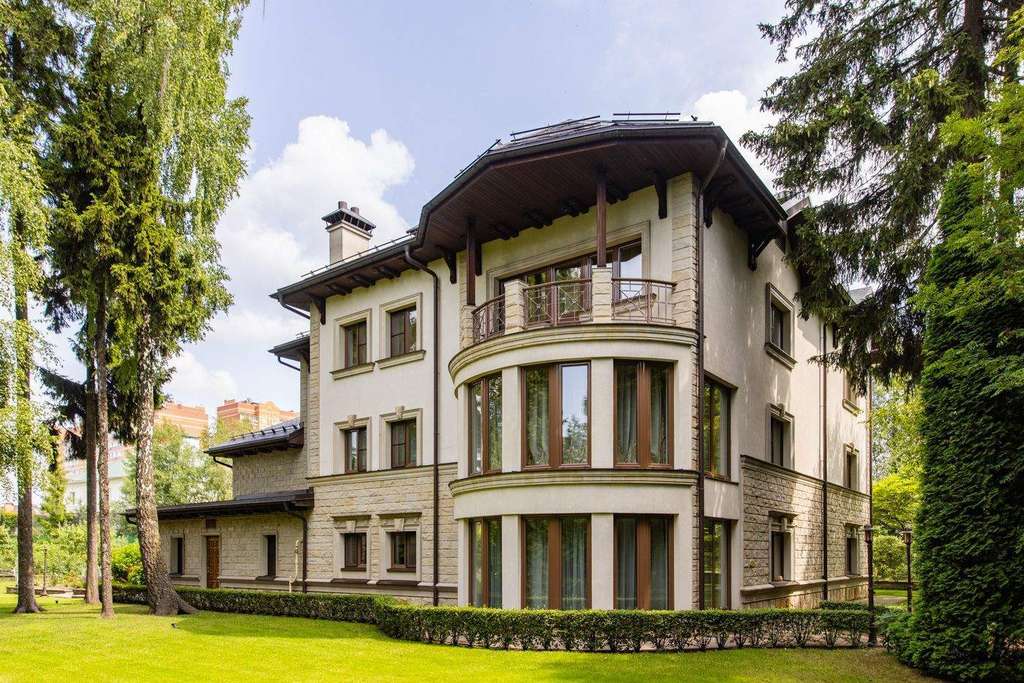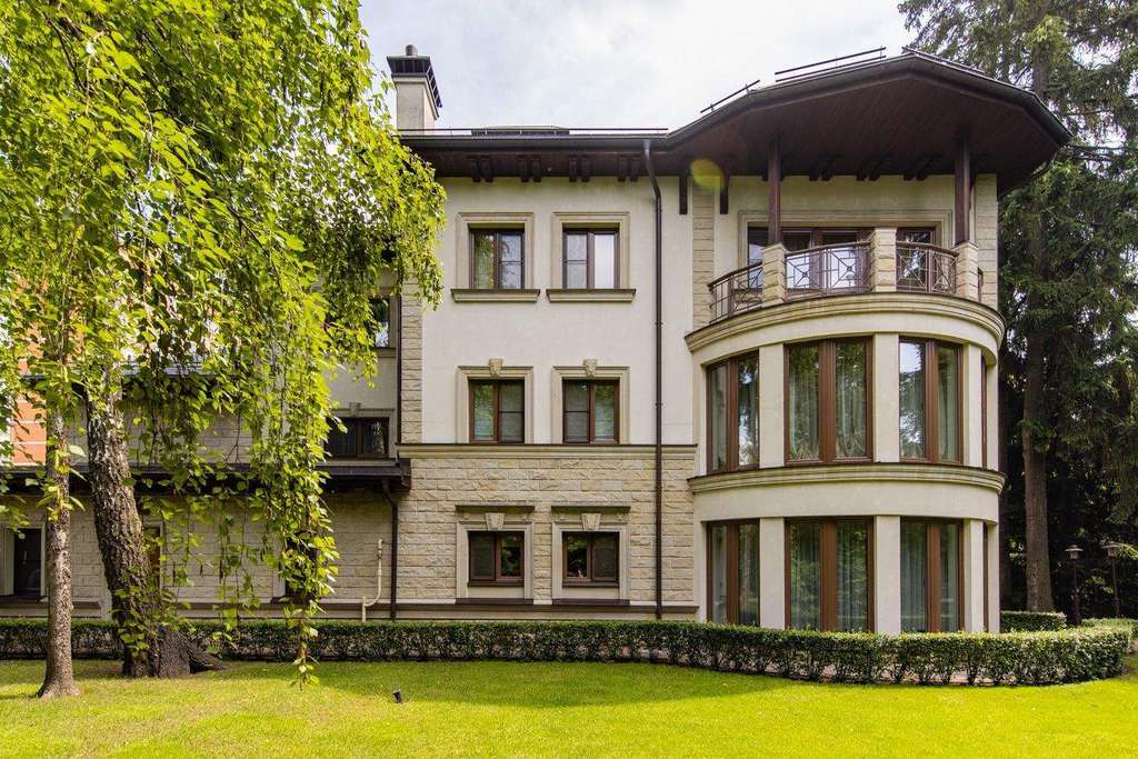 Роскошная загородная резиденция площадью 850 м расположена на просторном ухоженном участке 34 сотки рядом с лесом. Фасад в неоклассическом стилев бежевых тонах украшен рельефом камня и рустами. Фасад, выходящий на участок- с большим эркером и открытым балконом на третьем этаже.