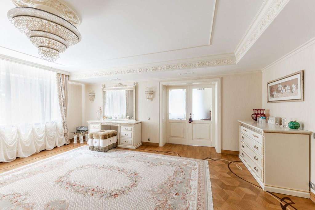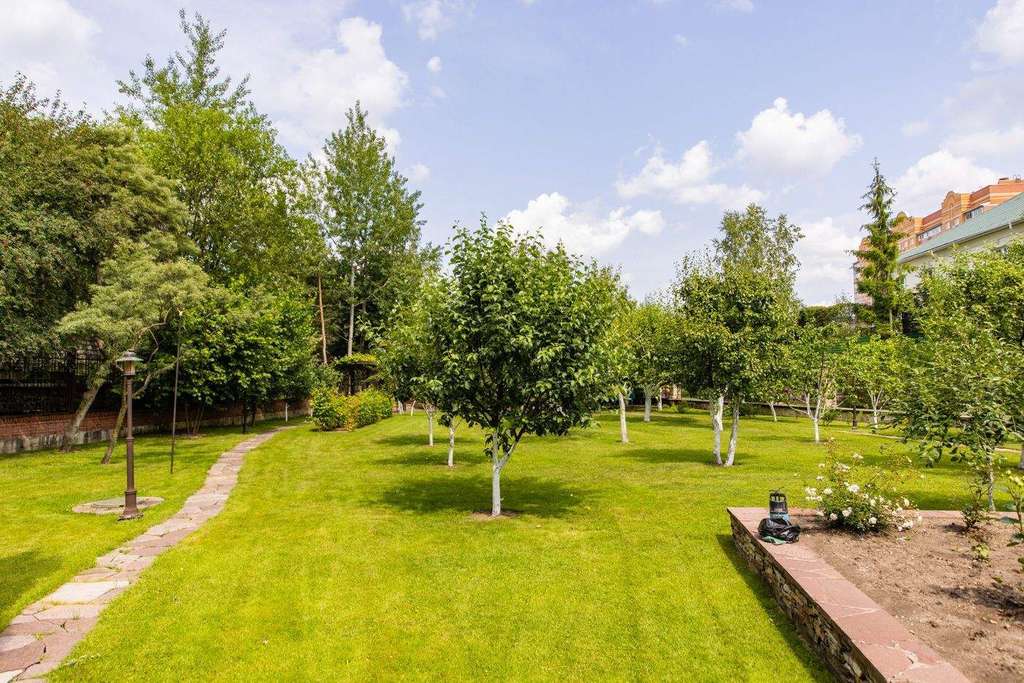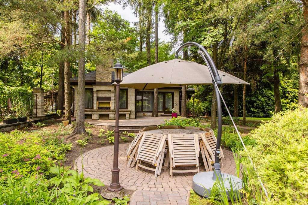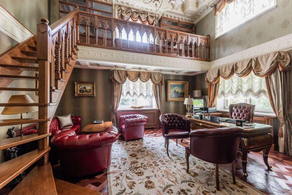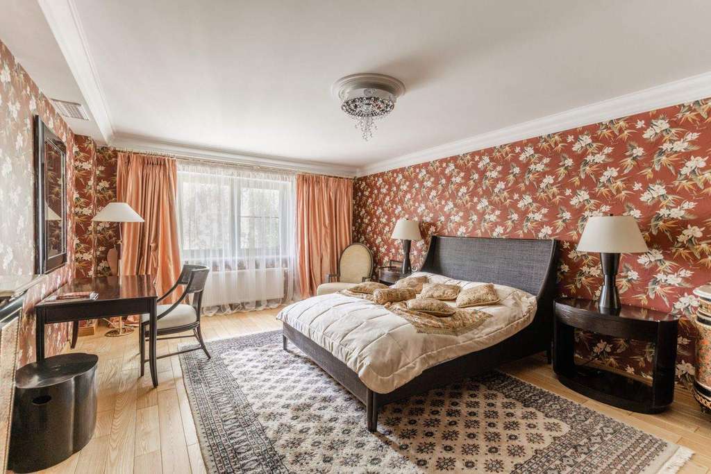 Интерьер выдержали в классическом стиле с обилием лепного декора на потолке, изысканной мебели и натурального дерева. На первом этаже расположена гостиная с камином, кухня и столовая. Витая лестница ведет на второй этаж, где находится спальня хозяев и домашний кинотеатр. На третьем этаже детские спальни, а в мансарде дополнительные гардеробные и бильярдная комната. На участке засеяли газон, посадили декоративные кустарники и цветы, разбили сад. Неподалекуот главного дома расположена остекленная беседка с печью для мангала.