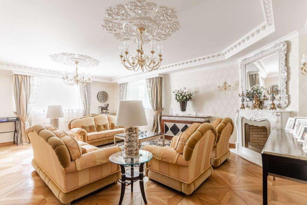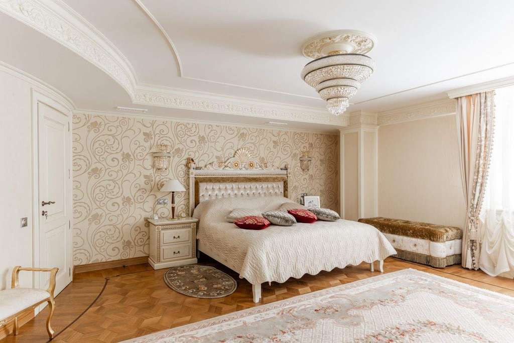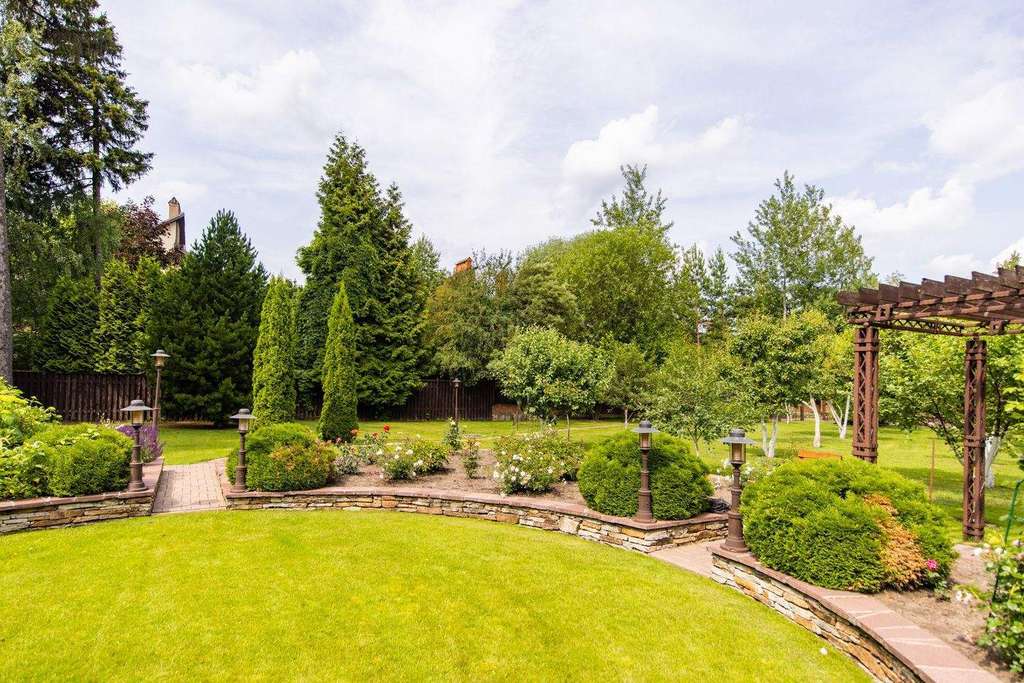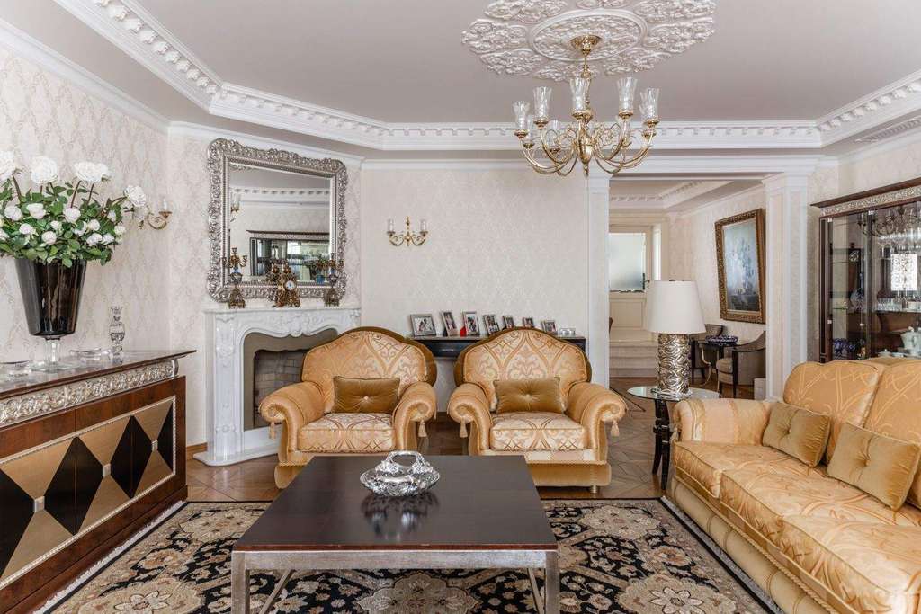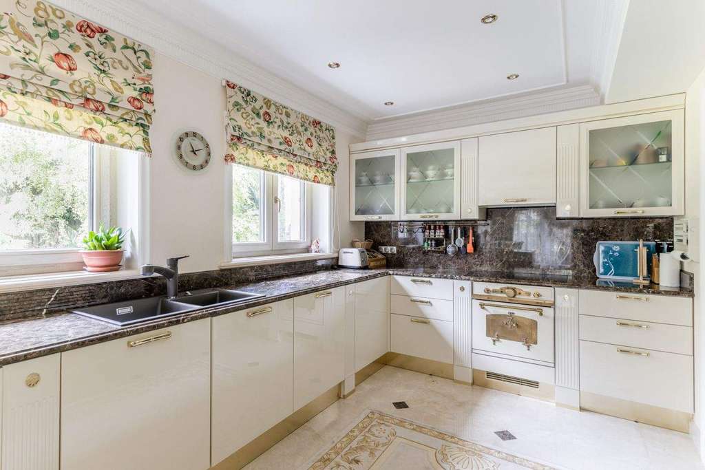 Интерьер выдержали в классическом стиле с обилием лепного декора на потолке, изысканной мебели и натурального дерева. На первом этаже расположена гостиная с камином, кухня и столовая. Витая лестница ведет на второй этаж, где находится спальня хозяев и домашний кинотеатр. На третьем этаже детские спальни, а в мансарде дополнительные гардеробные и бильярдная комната. На участке засеяли газон, посадили декоративные кустарники и цветы, разбили сад. Неподалекуот главного дома расположена остекленная беседка с печью для мангала.