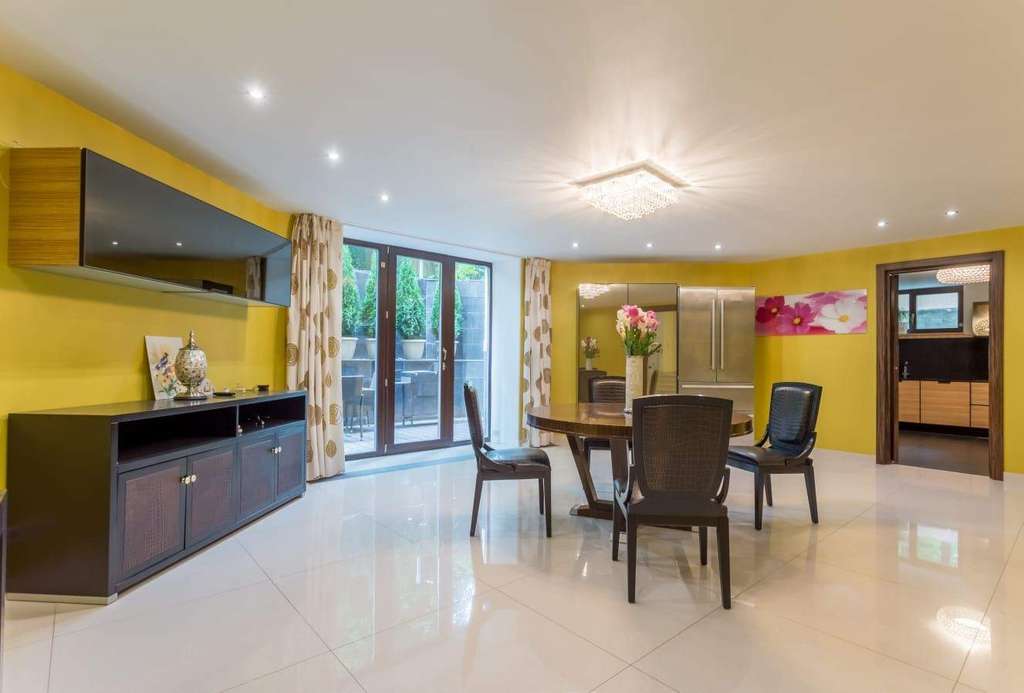 Цоколь: бассейн, сауна, комната отдыха, кладовая и технические помещения. 1-й уровень: гостиная с камином, кухня, столовая, терраса, 2 гостевые спальни и тренажерный зал. 2-й уровень: несколько спален с индивидуальными гардеробными и санузлами, кабинет, библиотека, детская игровая, комната для обслуживающего персонала и комната отдыха. Мансарда: небольшая спальня с санузлом и кинотеатр.