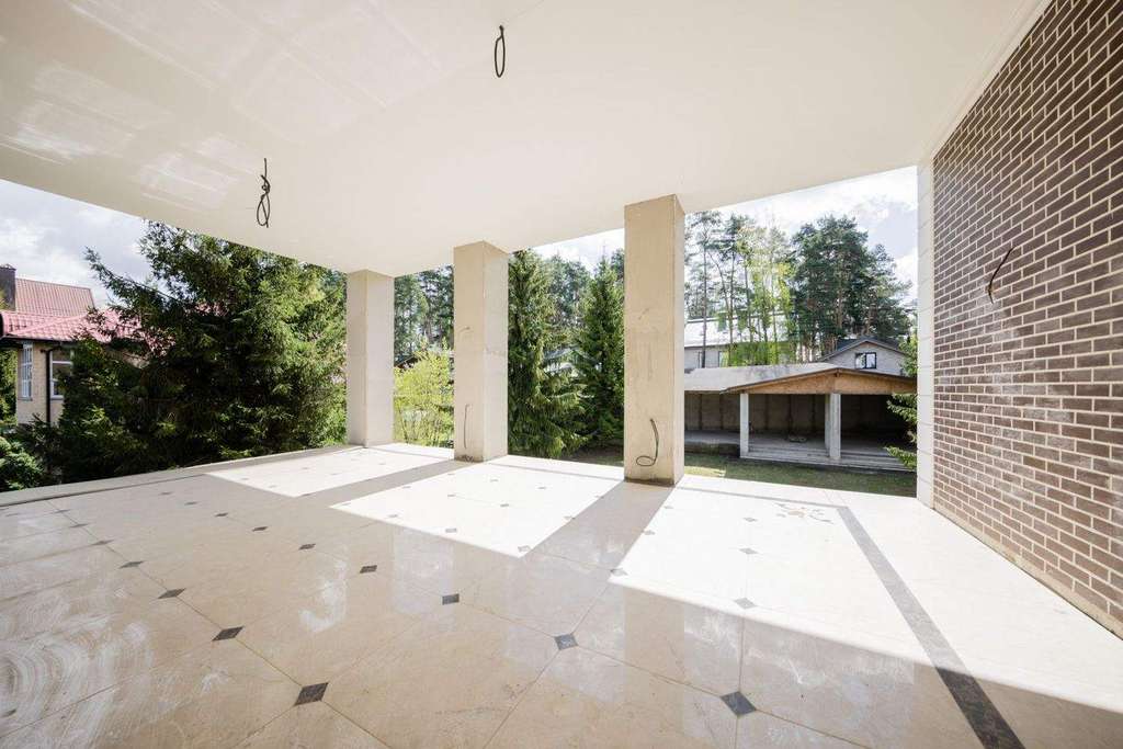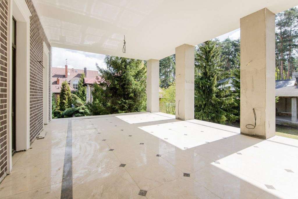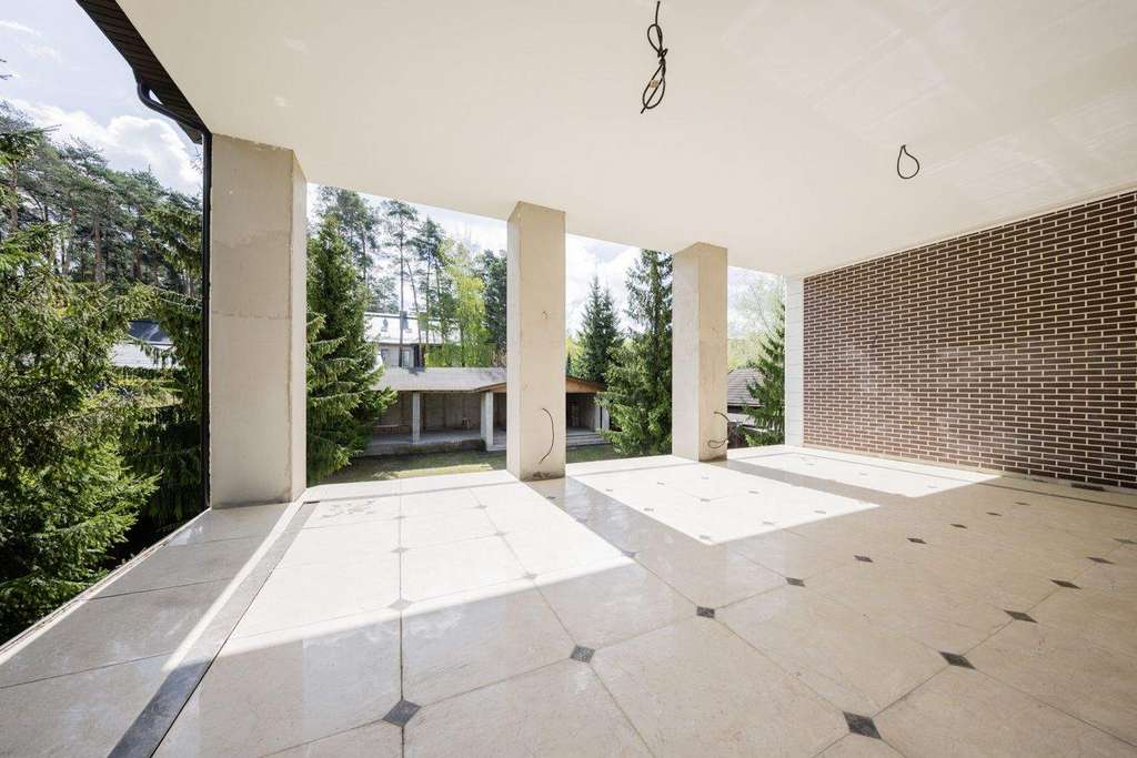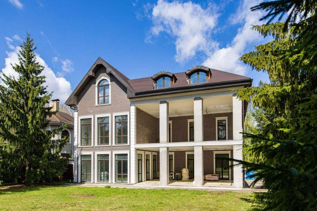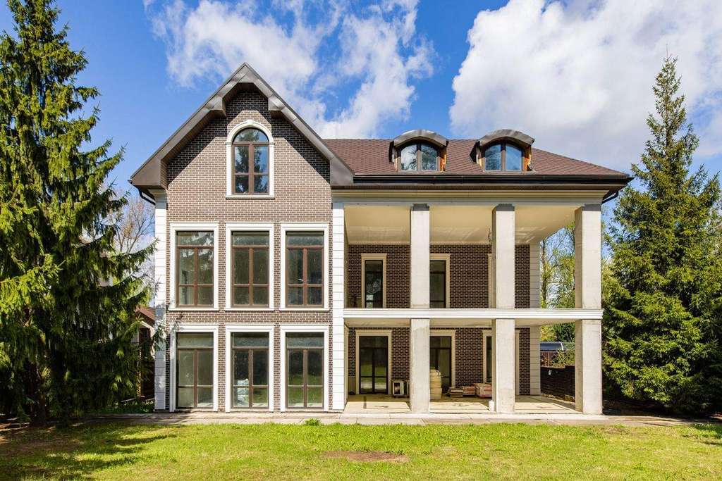 Просторный загородный дом площадью 1300 м построен на ровном полевом участке 15 соток без ландшафтного дизайна. Фасад в европейском стиле облицован коричневой клинкерной плиткой и натуральным камнем по цоколю, декорирован белыми наличниками и колоннами. В коттедже без отделки спланировали несколько спален, гостиную, кухню, кабинет, кинотеатр, спортзал, парилку и гараж. Укрыться от солнца и отдохнуть на свежем воздухе можно в тени террасы с видом на участок или в беседке.