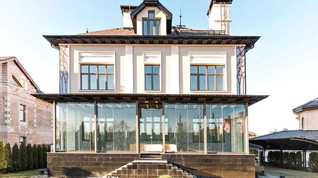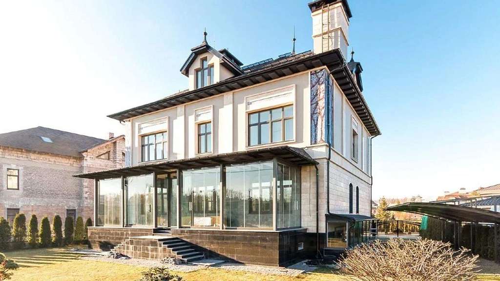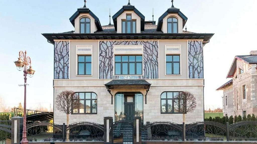 Дом площадью 669 м с элементами стиля «модерн» расположен на открытом участке 11 соток. Фасад облицован натуральным камнем и украшен мозаикой.