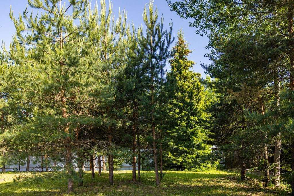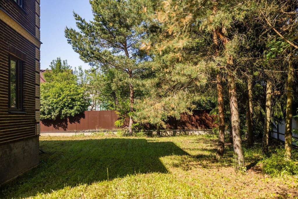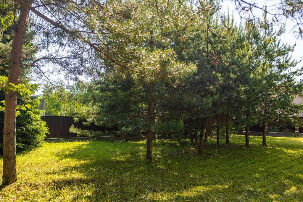 Планировкой резиденции предусмотрены 4 спальни, просторная гостиная, переходящая в зону кухни-столовой, кабинет. В контуре дома расположен гараж на 2 машины. На участке растут хвойные деревья.
