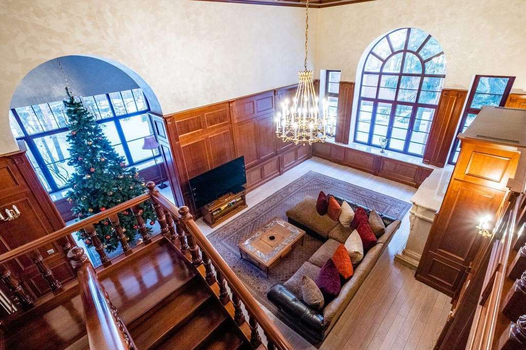 1 этаж: просторный холл, гостевой санузел, отдельная большая гостиная, двухсветная гостиная с камином и эркером, полностью оборудованная кухня со встроенной техникой MIELE, столовая с большой зоной остекления, спальня с ванной комнатой;