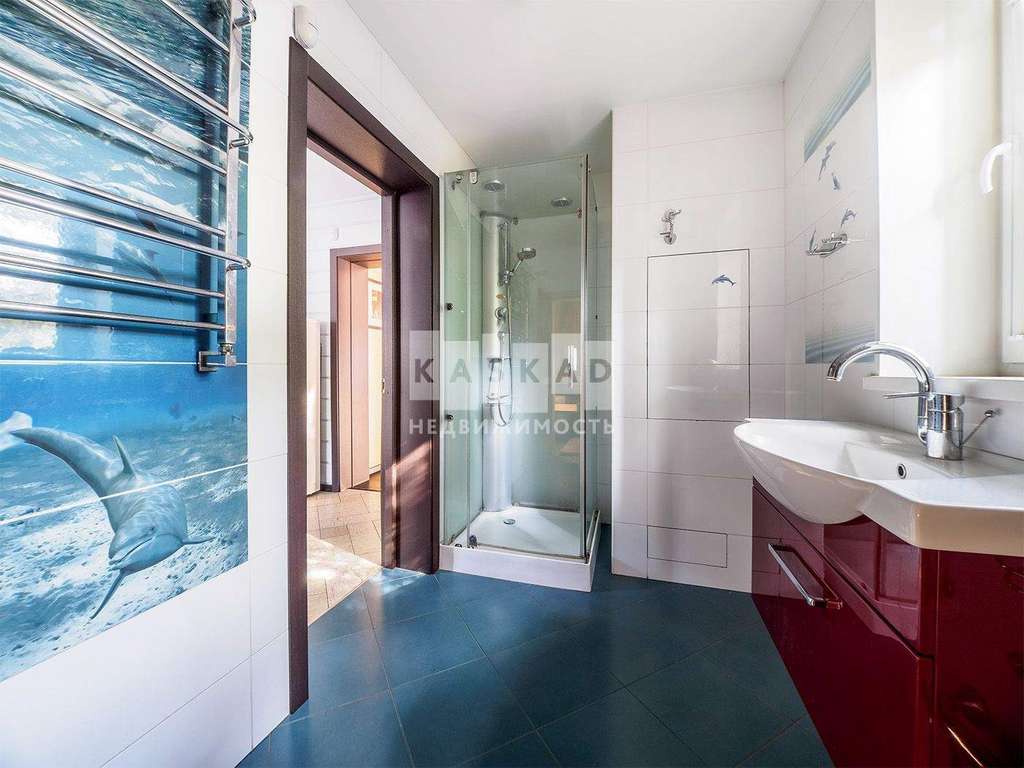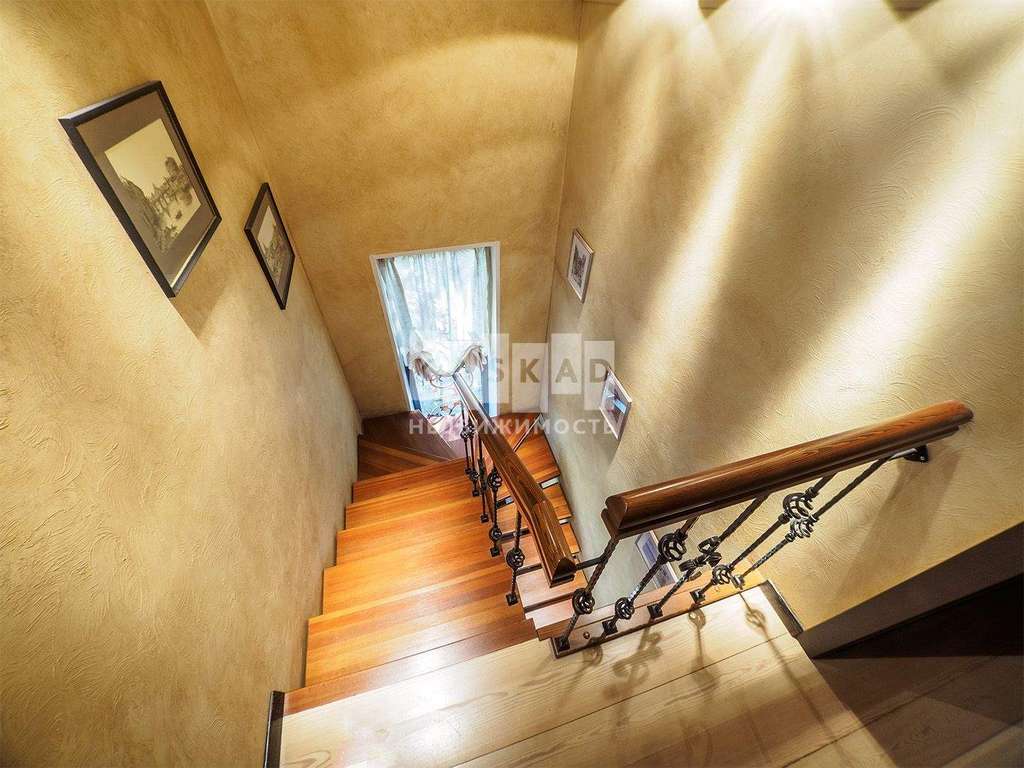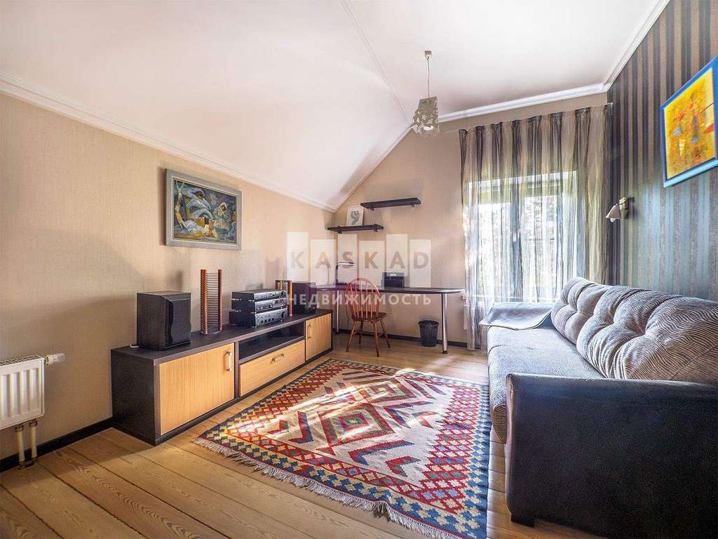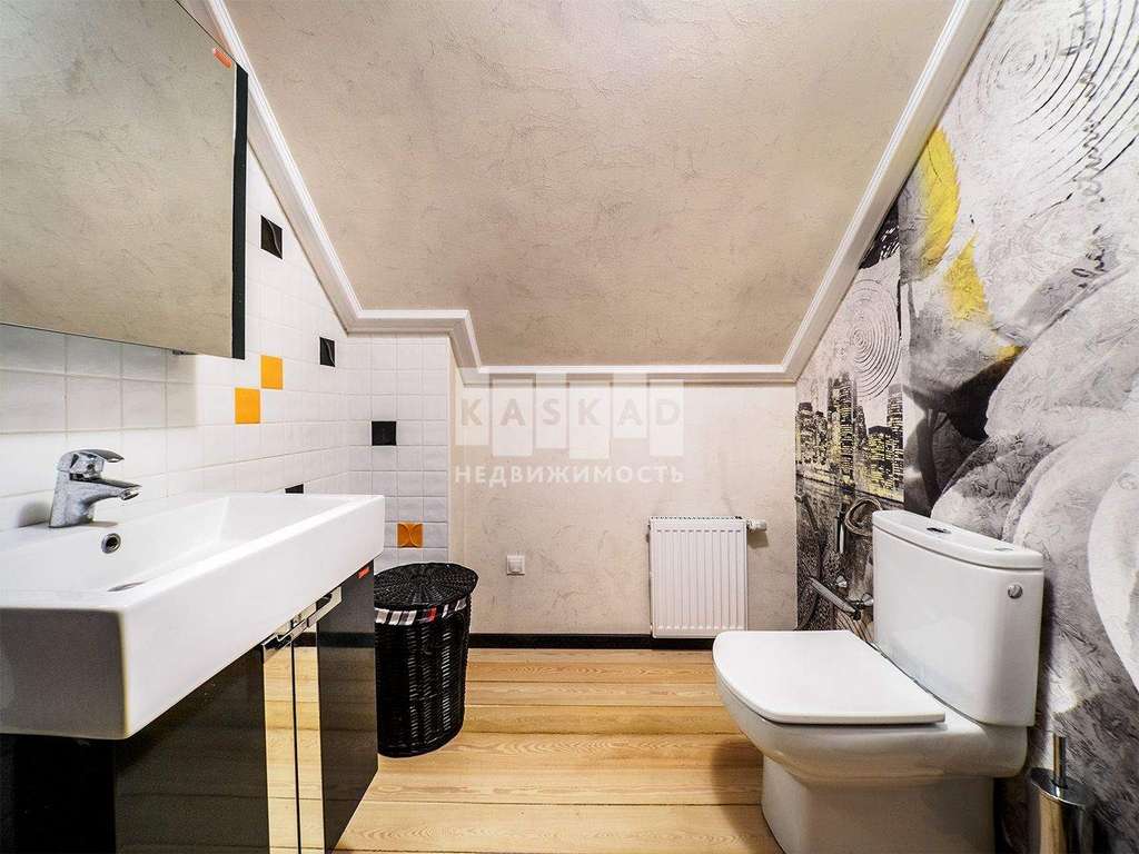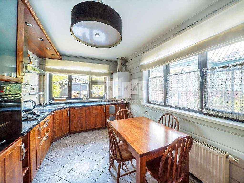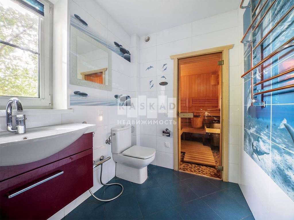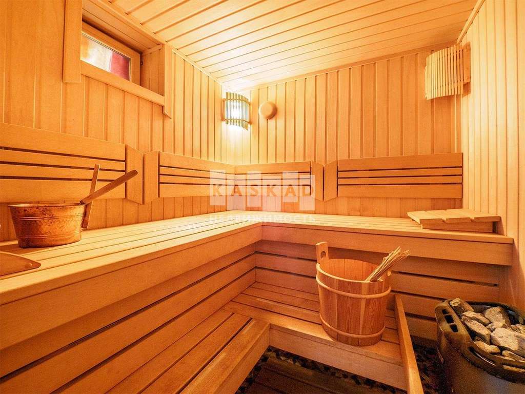 На первом этаже находится просторная кухня ( техника Bosch) гостиная, каминный зал, с/у со встроенной сауной и теплым полом.
