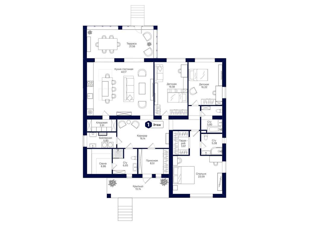 Дом удачно разделён на общую зону, которая состоит из прихожей, кухни с кладовой, гостиной и банного комплекса, и на приватную территорию только для владельцев дома и их детей. Предусмотрен камин.