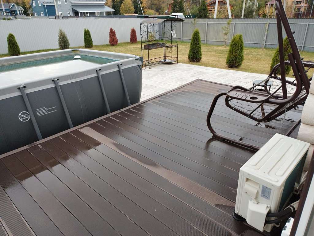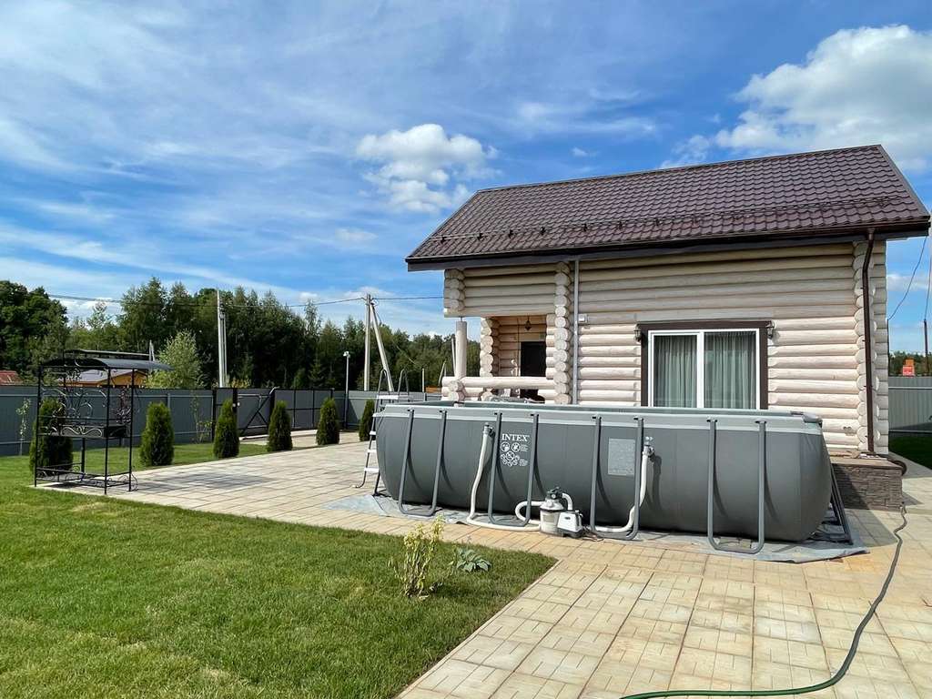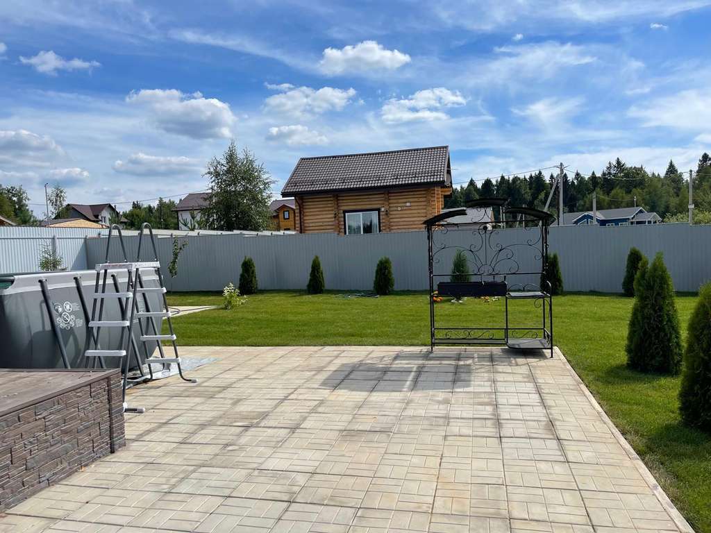 На участке дровяная баня, бассейн, качели, шезлонги.