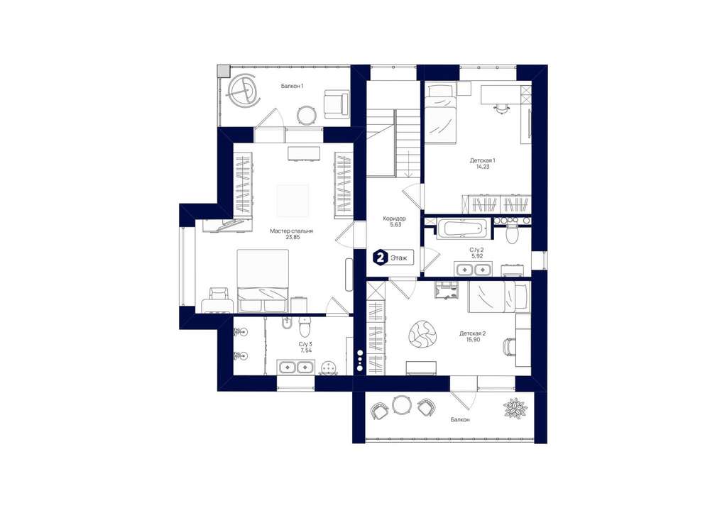 Изюминкой этого дома является мастер-спальня на втором этаже. Она имеет собственную ванную комнату и приватный балкон, выходящий в сад. Кроме того, приятным дополнением станет место для туалетного столика и дивана.