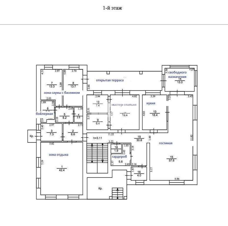 1 этаж - входная группа, бойлерная, гостиная, зона кухни, мастер-спальня, зона сауны с бассейном, зона отдыха, открытая терраса с видом на лес.