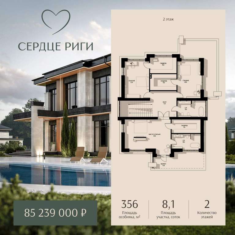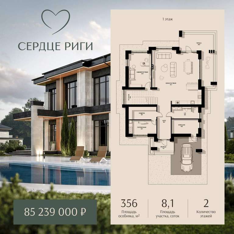 Продается дом общей площадью 356.5 м на участке 8.1 соток в коттеджном поселке СЕРДЦЕ РИГИ, всего в 18 км от МКАД.