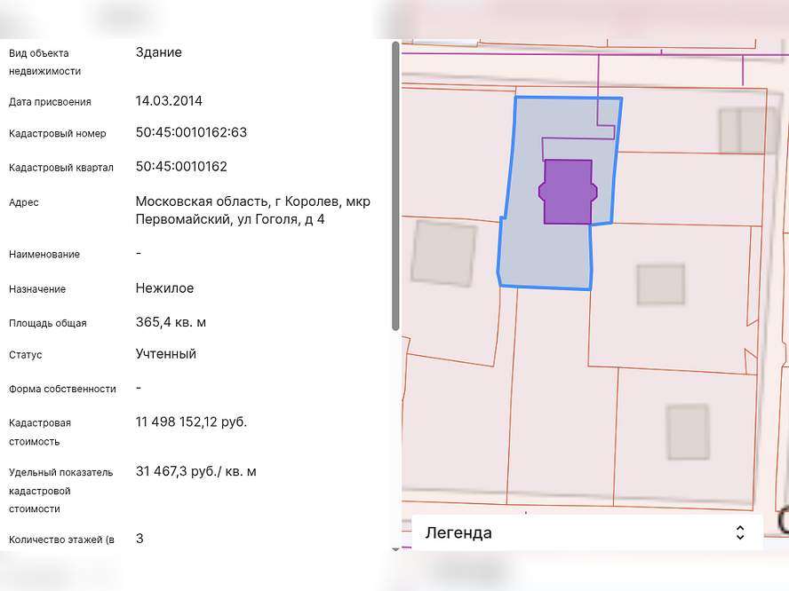 Состав лота: - Здание жилое, по адресу: Московская область, г. Королев, мкр. Болшево, ул. Гоголя, д. 4, площадью 365,4 кв. м, с кадастровым номером 50: 45: 0000000: 63439- Здание жилое, по адресу: Московская область, г. Королев, мкр. Болшево, ул. Гоголя, д. 6/5, площадью 161,4 кв. м, с кадастровым номером 50: 45: 0010161: 71- Здание жилое, нежилое, по адресу: Московская область, г. Королев, мкр. Болшево, ул. Толстого, д. 3, площадью 63,9 кв. м, с кадастровым номером 50: 45: 0000000: 3034- Газопровод высокого давления, ДРП, низкого давления на газификацию объекта, протяженность 47 м, год ввода в эксплуатацию 2014, с кадастровым номером 50: 45: 0000000: 61139- Сооружение нежилое, площадью 0,6 кв. м, с кадастровым номером 50: 45: 0010154: 160- Сооружение нежилое, площадью 0,8 кв. м, с кадастровым номером 50: 45: 0010154: 171- Земельный участок площадью 602 кв. м., кадастровый номером 50: 45: 0010162: 5- Земельный участок площадью 600 кв. м, с кадастровым номером 50: 45: 0010162: 4- Земельный участок площадью 1 073 кв. м, с кадастровым номером 50: 45: 0010162: 1- Земельный участок площадью 60 кв. м, с кадастровым номером 50: 45: 0010162: 14- Земельный участок площадью 14 кв. м, с кадастровым номером 50: 45: 0010162: 15- Земельный участок площадью 1310 кв. м, с кадастровым номером 50: 45: 0010162: 10координаты: 55.92702969, 37.8909016