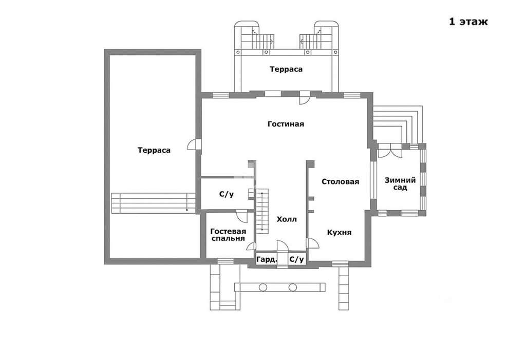 1 этаж: прихожая, гардеробная, гостевой санузел, кухня, столовая, гостиная с выходом на террасу, зимний сад, гостевая спальня с санузлом;
