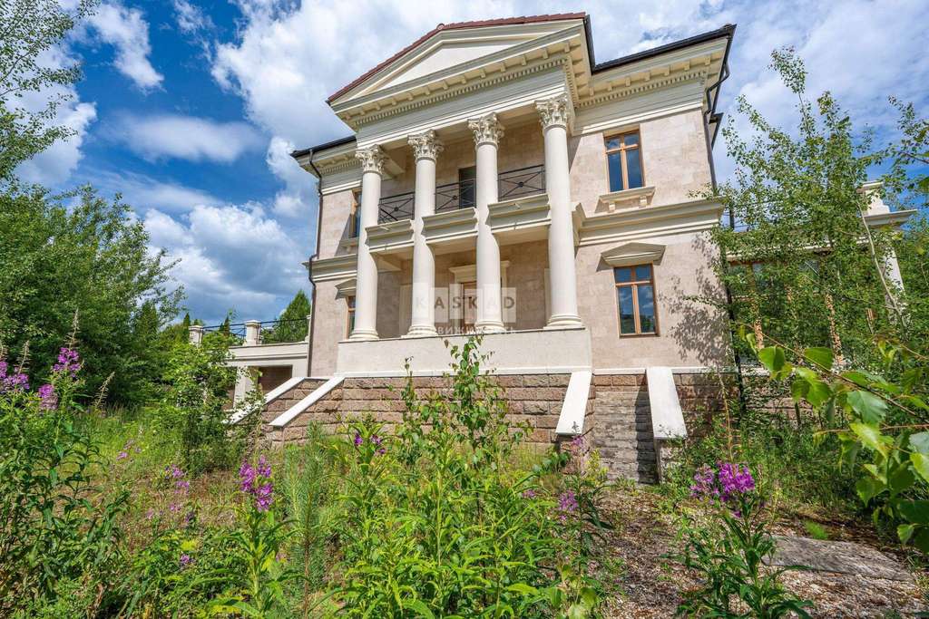 Этот дом, возведенный из керамического кирпича в классическом архитектурном стиле, украшен светлыми колоннами и балконными ограждениями. Для облицовки фасада использован натуральный камень - травертин.