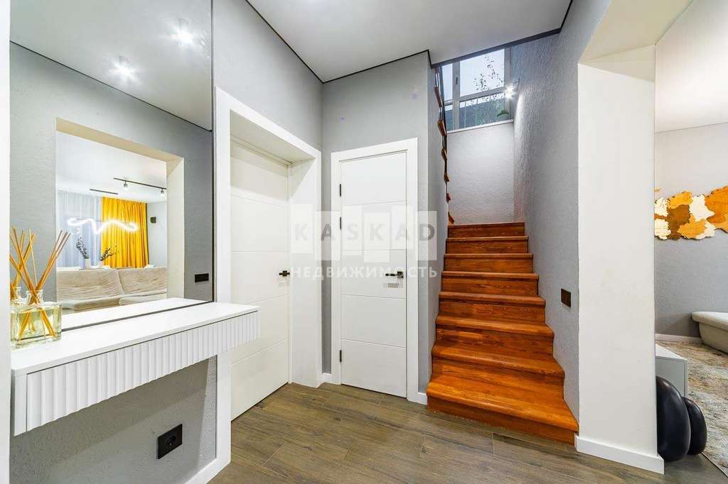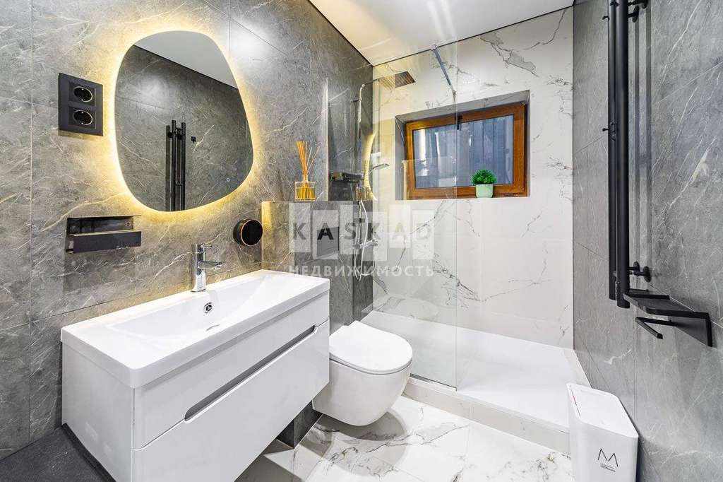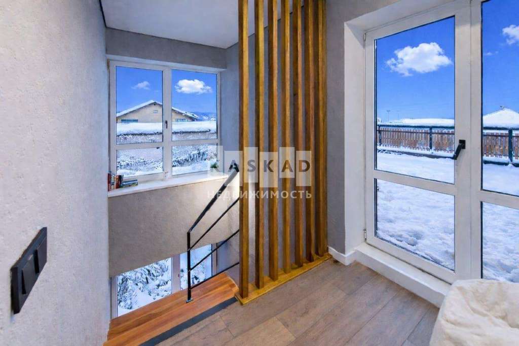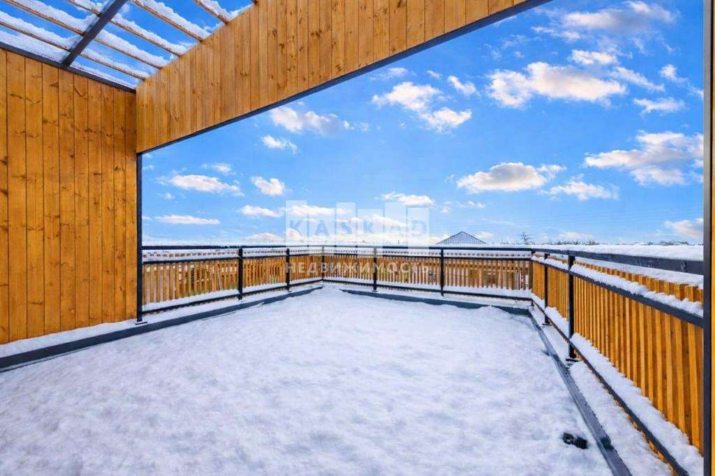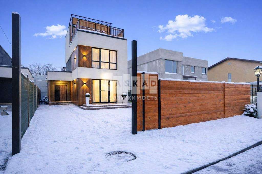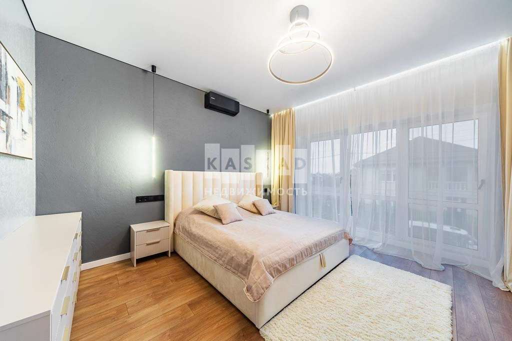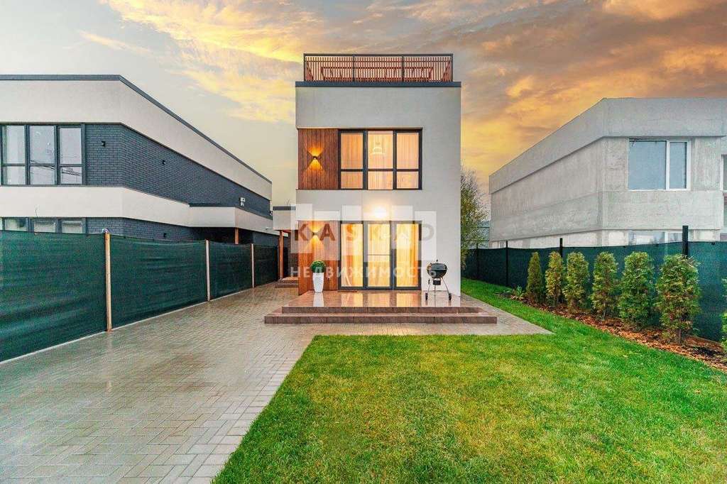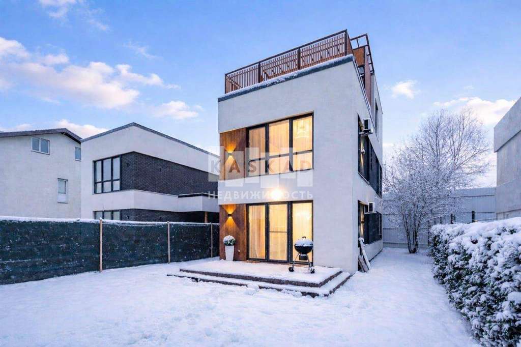 В доме 4 спальни, одна из которых расположена на третьем этаже, подходит под кабинет. На крыше дома есть просторная терраса, откуда открывается вид на весь поселок. Участок полностью огорожен, выстелен газон, посажены декоративные растения. Имеется система видеонаблюдения.