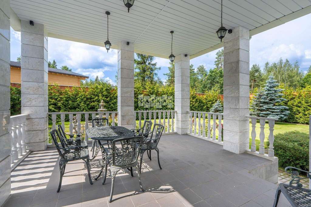 Эта великолепная усадьба расположена на участке в 28 соток, окруженном высокими многолетними туями и продуманным ландшафтным дизайном. На территории имеются: фонтан с четырьмя скульптурами, дополнительное строение с гаражом на два автомобиля и двухкомнатная квартира для обслуживающего персонала, теплица, а также вольер для собаки.