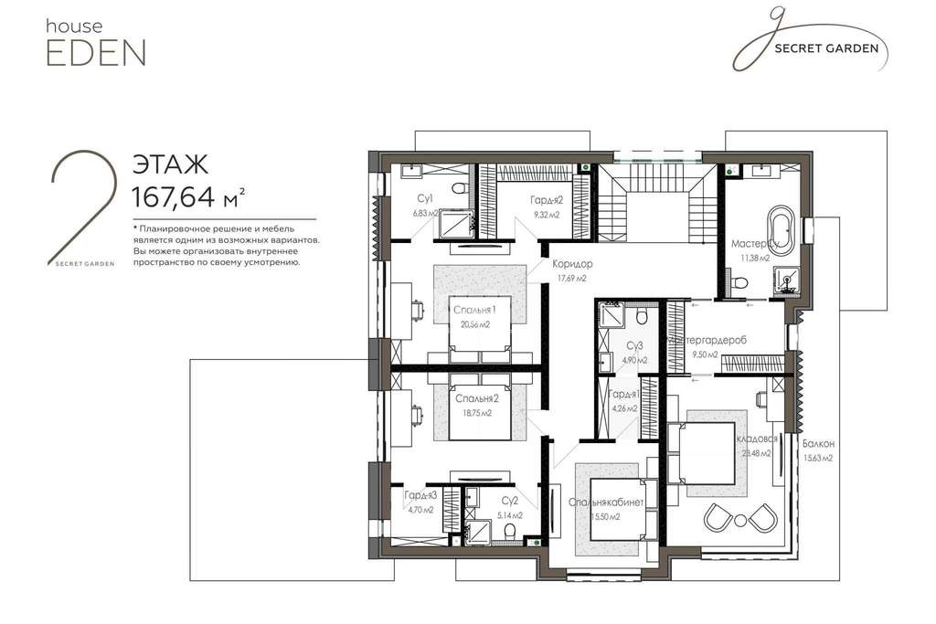 2 этаж: ЧЕТЫРЕ роскошных уникальных спальни со своими санузлами и гардеробными.