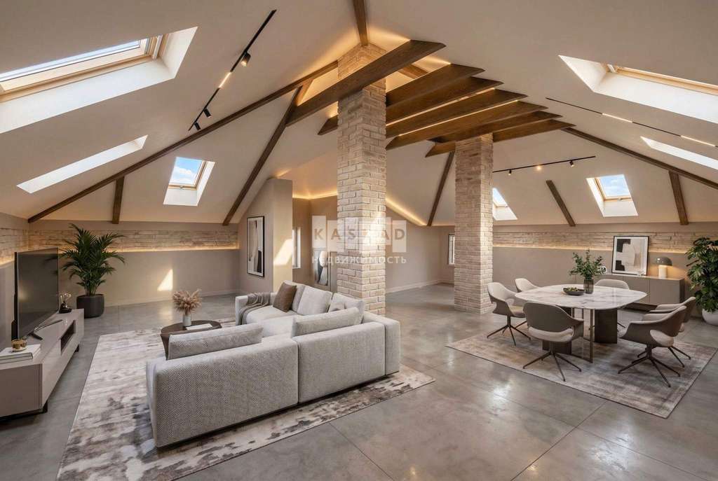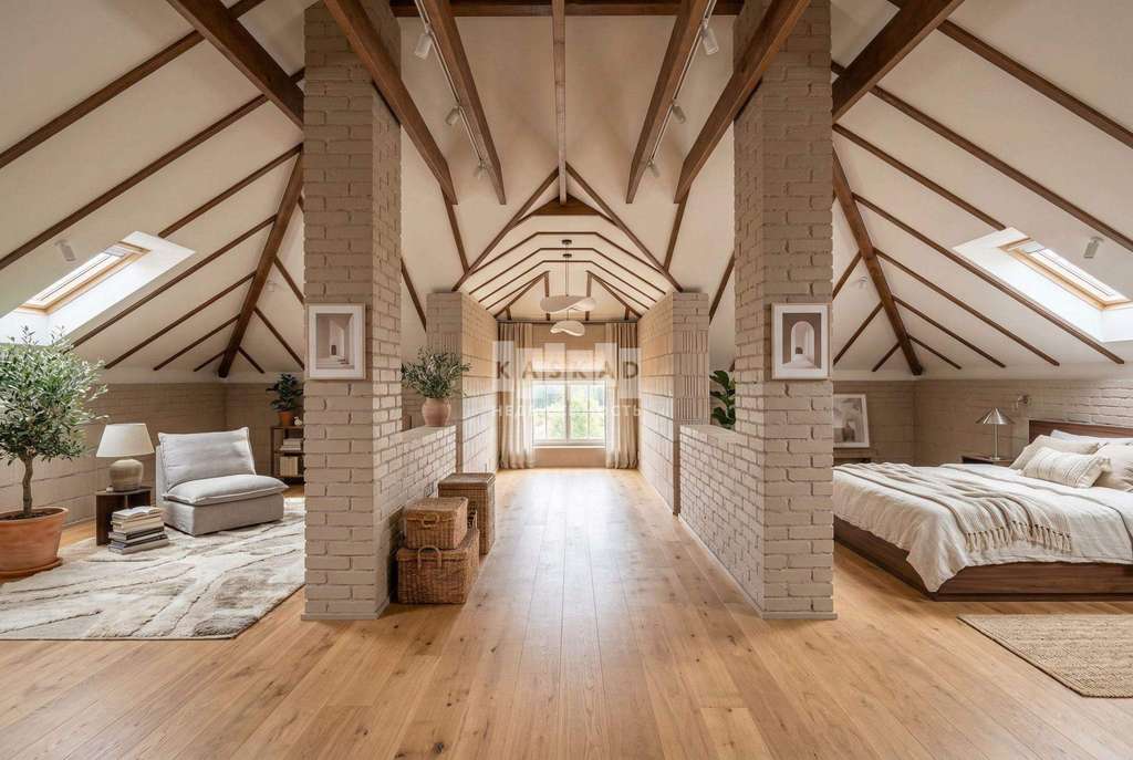Дом имеет два полноценных этажа и мансардное пространство с высокими потолками 4,2 метра, что наполняет помещения простором и светом. Толщина стен 50 см, основание выполнено в виде свайно-ростверкового фундамента, что обеспечивает надежность и устойчивость конструкции.