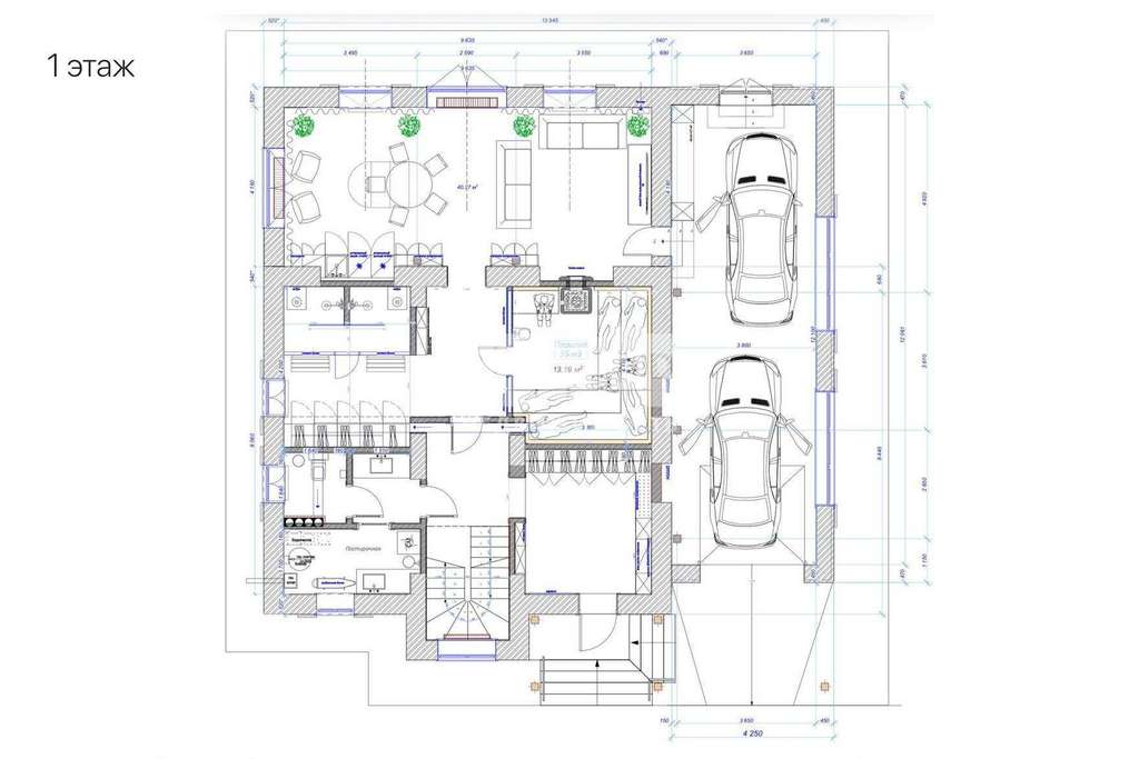 1 этаж: прихожая, холл, кухня-столовая, гостиная, котельная, санузел;