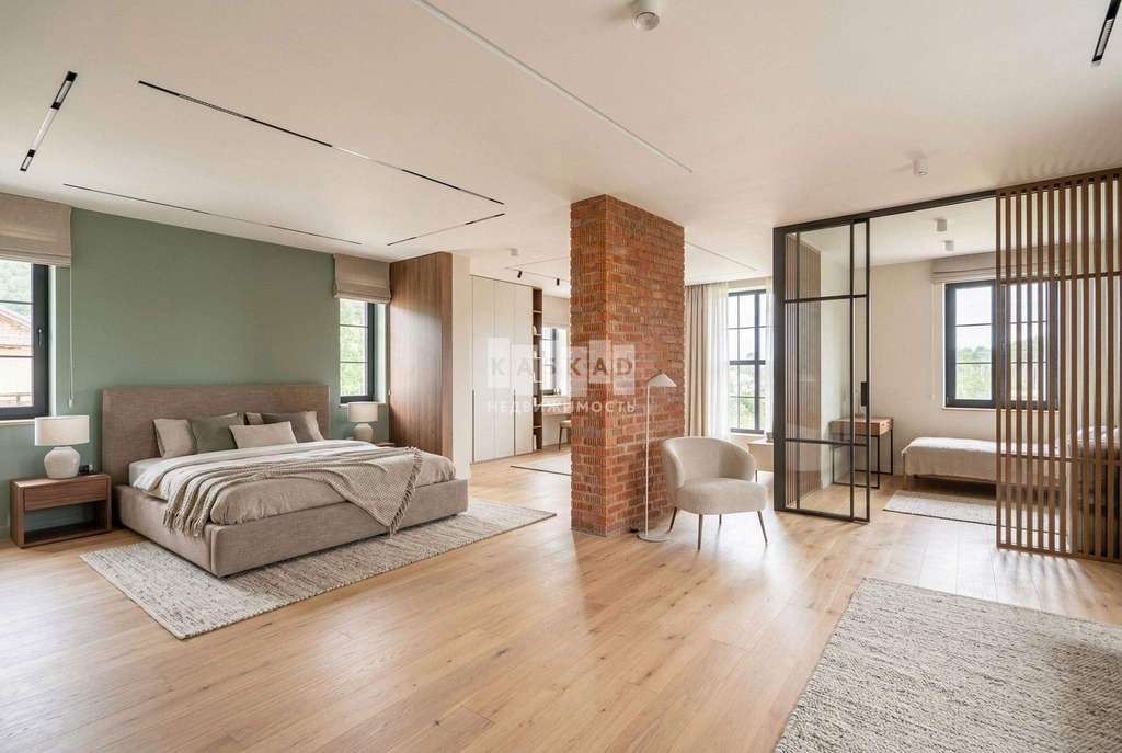 Обширная гостиная с витражным остеклением и доступом на участок, а также спальни с прекрасными видами создают атмосферу спокойствия и единения с природой.