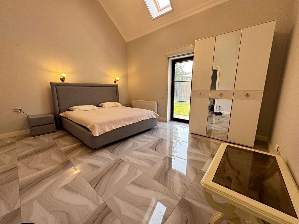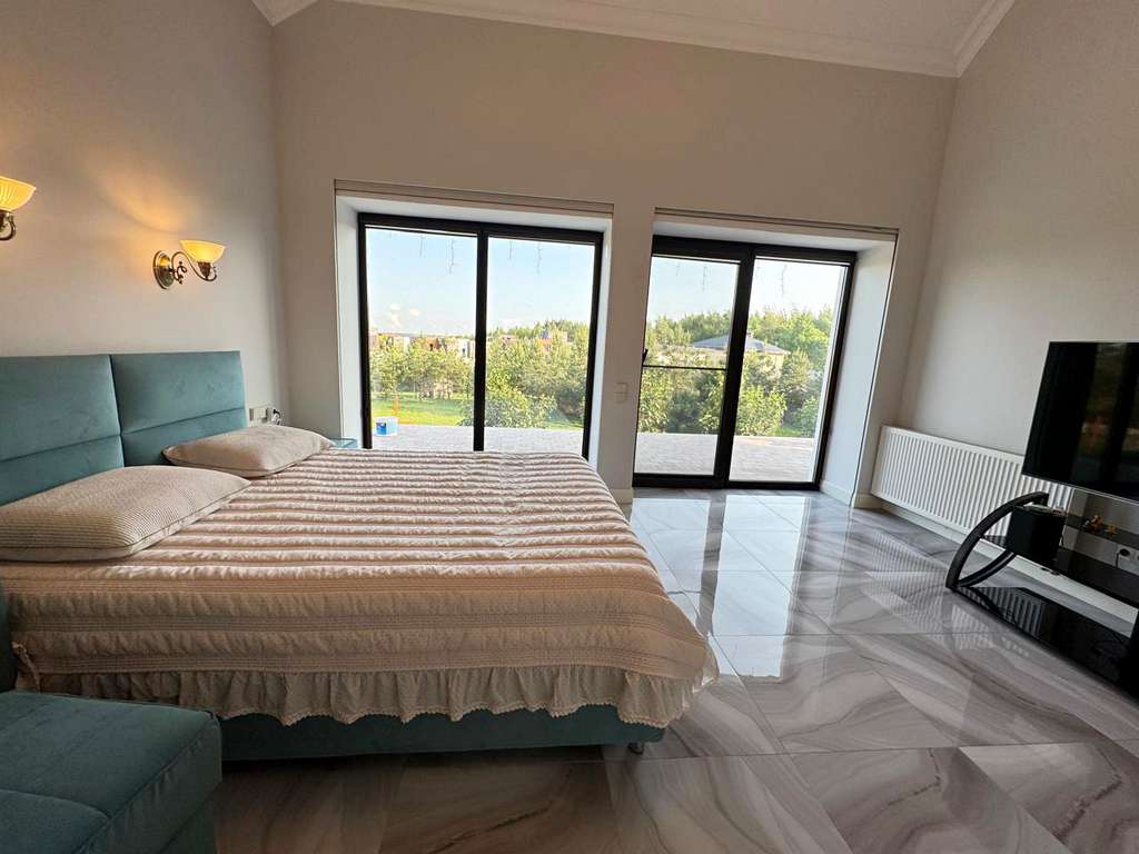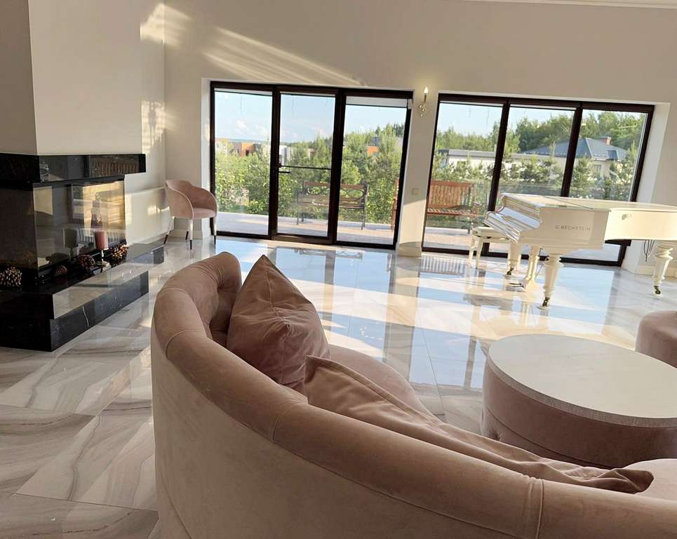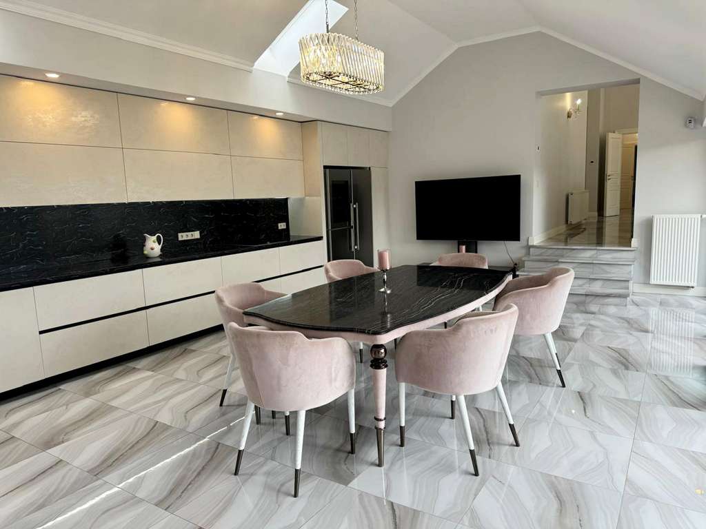 В доме по проекту кухня-столовая, большая гостиная с выходом на террасу, гостевая (кабинет) , гардеробная- прачечная, холл, 5 санузлов, постирочная, гостевая квартира. Отапливаемый гараж на 2 машины, современное инженерное оборудование. Высота потолков 4,5 м.