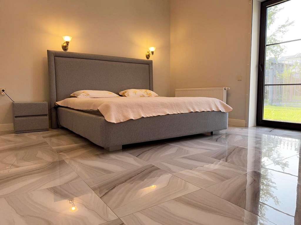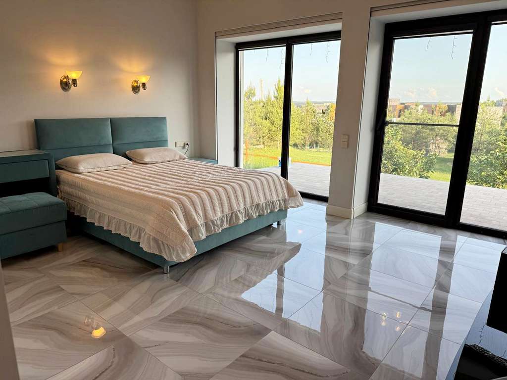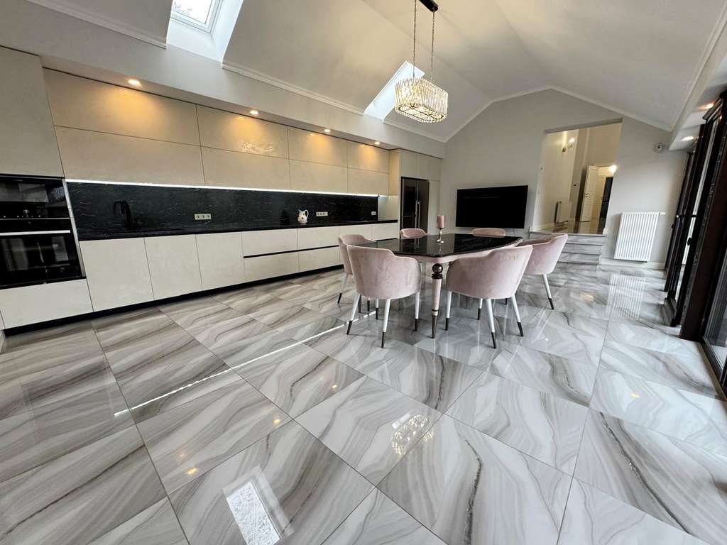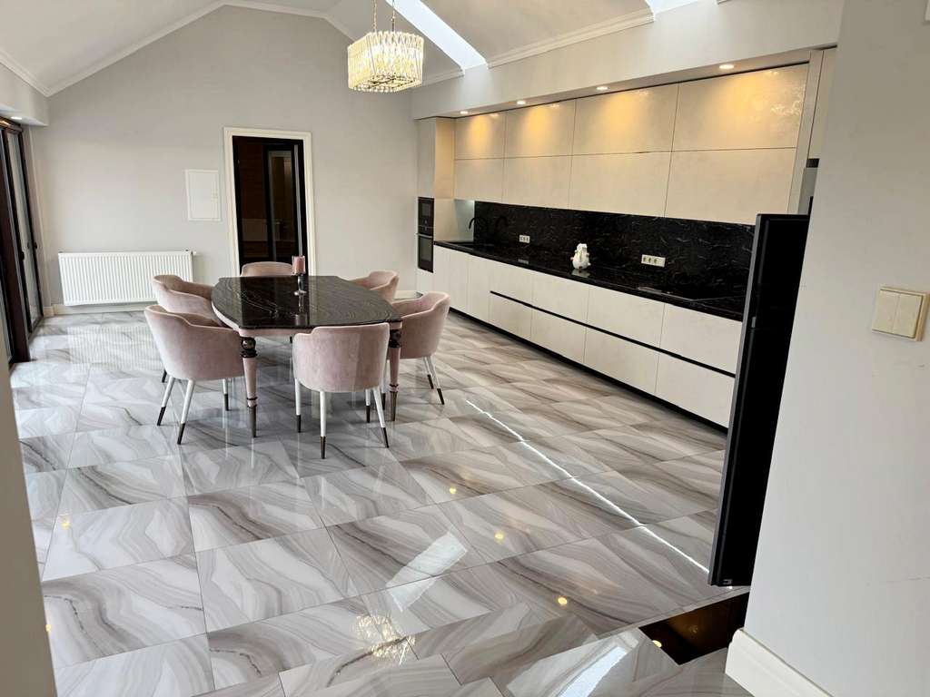 В доме по проекту кухня-столовая, большая гостиная с выходом на террасу, гостевая (кабинет) , гардеробная- прачечная, холл, 5 санузлов, постирочная, гостевая квартира. Отапливаемый гараж на 2 машины, современное инженерное оборудование. Высота потолков 4,5 м.