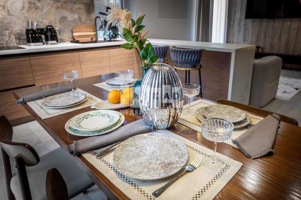 1 этаж: большая гостиная - кухня оформлена в авторском стиле и оборудована по последнему слову техники. Есть все необходимое высокого качества, удовлетворяющее самый изысканный запрос. В этом пространстве можно готовить любимые блюда, проводить время за столом с семьей и гостями, удобно расположившись смотреть кино, а также наслаждаться свежим воздухом на прекрасно оборудованной веранде. Веранда с выходом из гостиной просторная, защищена крышей и красиво оформленными стенами. Отсюда же удобный прямой выход к зоне мангала и барбекю.