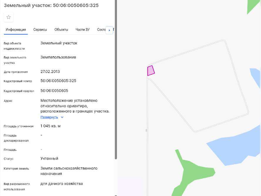 Земельный участок: кадастровый номер 50: 06: 0050605: 325. Почтовый адрес: Московская область, Шаховской район, с/пос. Степаньковское, юго-западная часть кадастрового квартала 50: 06: 0050605. Площадь: 1045 +/- 16. Категория земель: Земли населенных пунктов. Виды разрешенного использования: для дачного хозяйства. Координаты: 55.95509483, 35.48218346