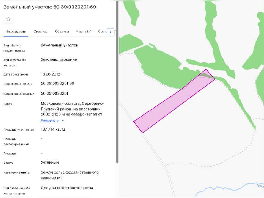 Земельный участок: кадастровый номер 50: 39: 0020201: 69. Адрес: Московская область, Серебряно-Прудский район, на расстоянии 2000-2100 м на северо-запад от ориентира - жилой дом № 93 в с. Глубокое. Площадь: 107 714 +/- 2 872 кв. мКатегория земель: Земли сельскохозяйственного назначения. Виды разрешенного использования: Для дачного строительства. Координаты: 54.55908885, 38.53540274