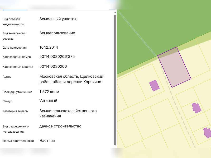 Земельный участокплощадью 1 572 кв. мкатегория земель: Земли сельскохозяйственного назначениявид разрешенного использования: дачное строительствокадастровым номером: 50: 14: 0030206: 375координаты: 56.03109353, 38.04230651