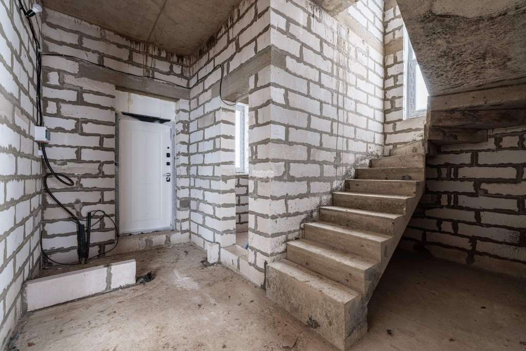 Фундамент - монолитная плита, стены - газоселикатный блок+утеплитель, крыша - натуральная черепица, лестница- монолитная.