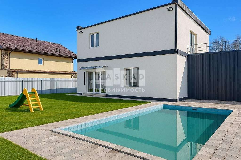 Коттедж построен на участке ровной формы, имеется открытый бассейн, гараж со входом в дом, подведены все коммуникации, выполнен качественный ремонт.