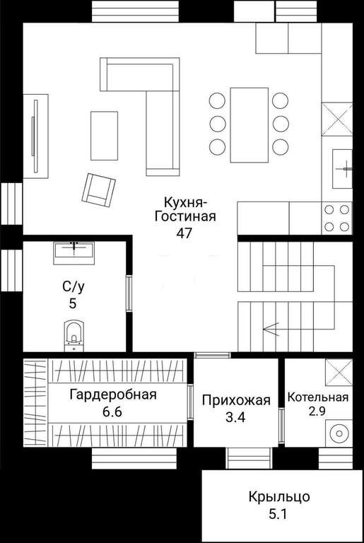 1 этаж: Входная группа, просторная кухня-гостиная, гардеробная, сан. узел, бойлерная.